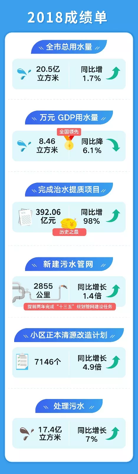 水資源保障能力持續(xù)加強!全市自來水水質(zhì)綜合合格率保持在99.9%!我們完成優(yōu)質(zhì)飲用水入戶工程小區(qū)312個和120個供水管網(wǎng)改造工程社區(qū),創(chuàng)建311個優(yōu)質(zhì)飲用水達標小區(qū)。