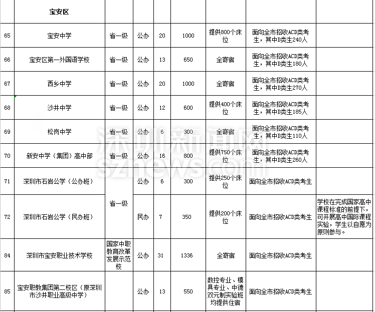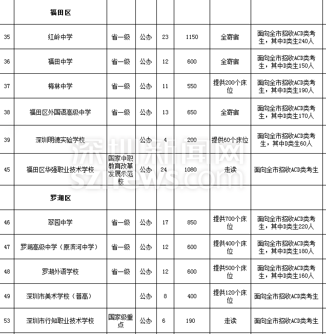 記者查閱了深圳市教育局2018年發(fā)布的高中階段學校招生計劃表。除去民辦學校,深圳共有71所公辦高中階段學校(含普高、職高)參與招生,其中普高占50所,提供34379個學位。