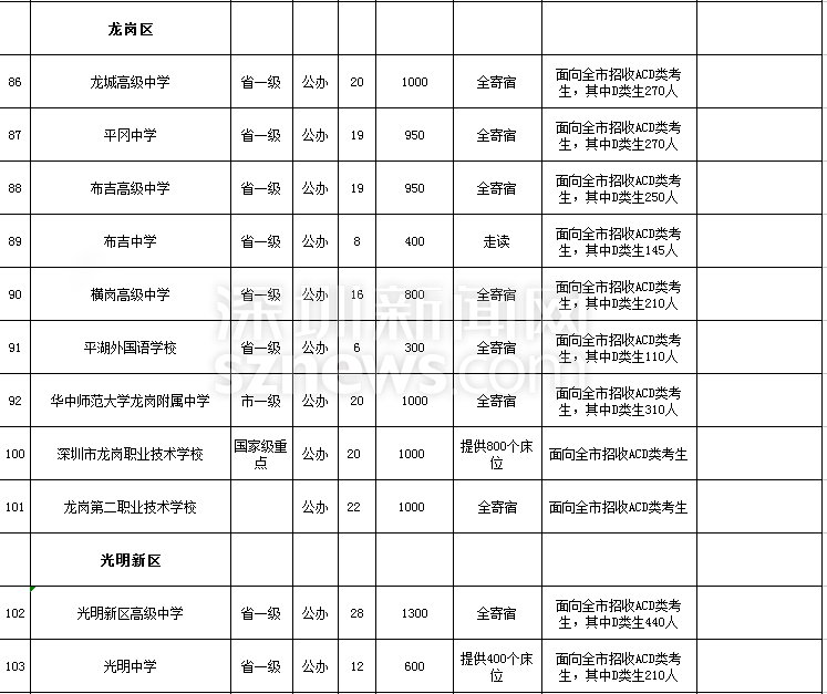 深圳市2018年高中階段學校招生計劃表