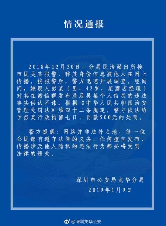 ⑥1月9日,警方發(fā)布通報。嫌疑人彭某因在微信群發(fā)布涉及吳某(微博 ID:花總丟了金箍棒)的個人信息,被警方行拘七日,罰款500元。