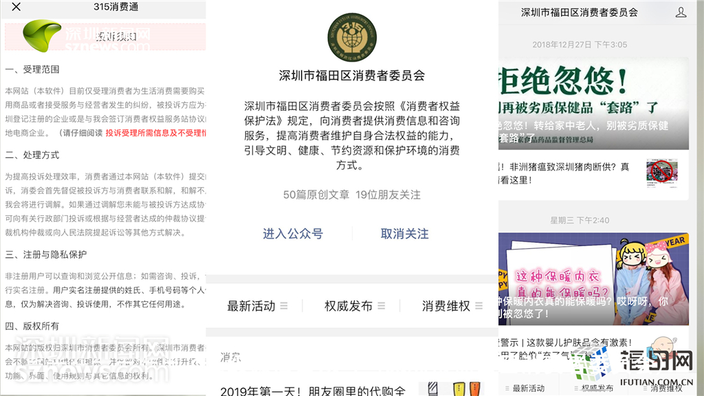 福田區(qū)消委會微信公眾號界面,包含消費(fèi)維權(quán)投訴、發(fā)布消費(fèi)警示等內(nèi)容。