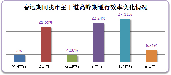 經(jīng)對(duì)我市城區(qū)主干道高峰期車流量監(jiān)測(cè),預(yù)計(jì)春運(yùn)期間我市早晚高峰道路日趨順暢,全市各條主干道及進(jìn)出關(guān)道路平均通行效率提高一成,北環(huán)東行、泥崗路西行行車效率提升最為明顯。