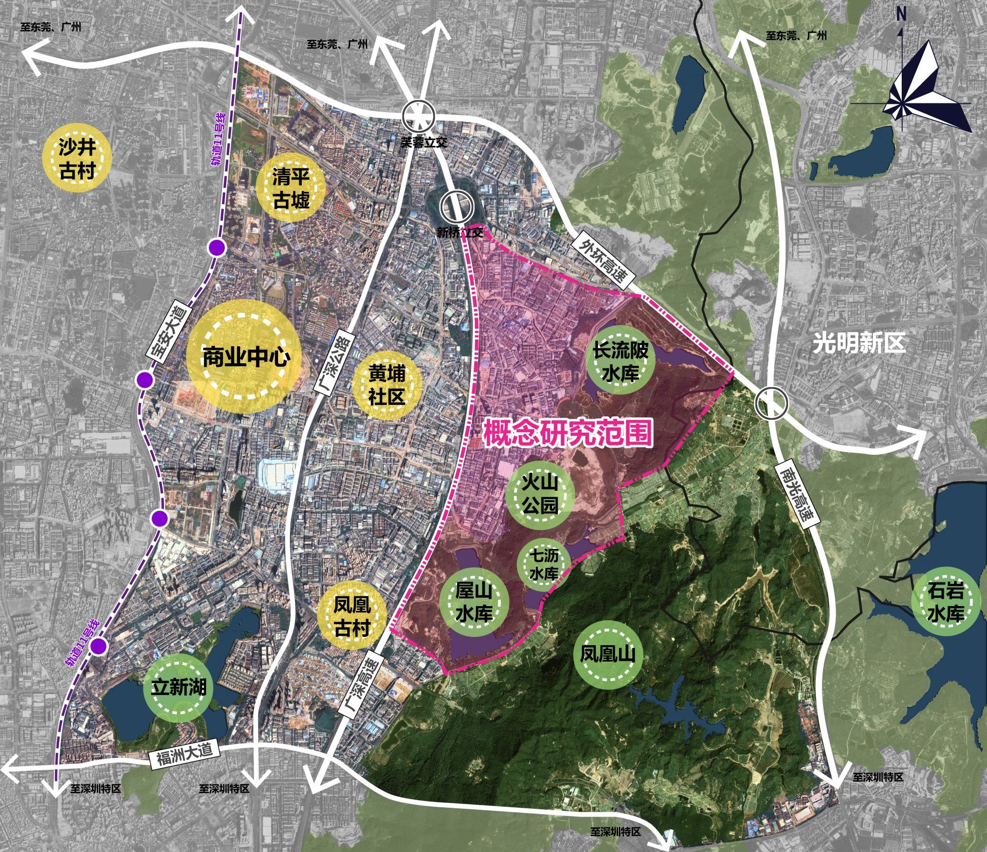 概念規(guī)劃范圍包含詳細(xì)設(shè)計范圍在內(nèi)的周圍關(guān)聯(lián)緊密地區(qū),用地約10平方公里,北至新玉路和外環(huán)高速,西至廣深高速,南至鳳凰第二工業(yè)區(qū),東部為包含“三庫一園”(屋山水庫、長流陂水庫、七瀝水庫及火山公園)在內(nèi)關(guān)聯(lián)緊密的自然山體、水等要素。