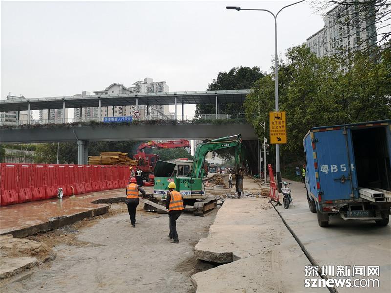 福田僑香路是人大代表楊勤調(diào)研的第二個點,從現(xiàn)場可以看到,目前僑香路人行道正在進行施工,不少大型機械正在作業(yè),發(fā)出陣陣轟鳴聲,來往行人只能繞道。