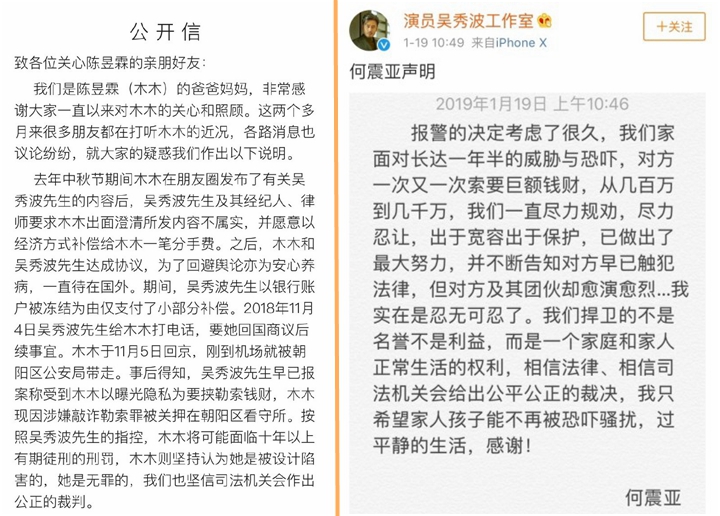 深圳新聞網1月22日訊(記者 張玲)近日,演員吳秀波婚內出軌事件再度發(fā)酵在微博引發(fā)熱搜,而這次事件的主角則是之前銷聲匿跡已久的陳昱霖(藝名)。2019年1月18日,陳昱霖父母微博公開發(fā)表聲明稱女兒被吳秀波欺騙回國后,吳秀波以“曝光隱私威脅勒索錢財”為由報警,女兒在下飛機后即被警方抓捕。隨后,吳秀波妻子何震亞發(fā)表聲明反擊,稱陳昱霖多次威脅索要巨額財務,數(shù)額一度高達千萬,在忍無可忍的情況下才選擇報警,希望通過司法途徑維護自己的權益。