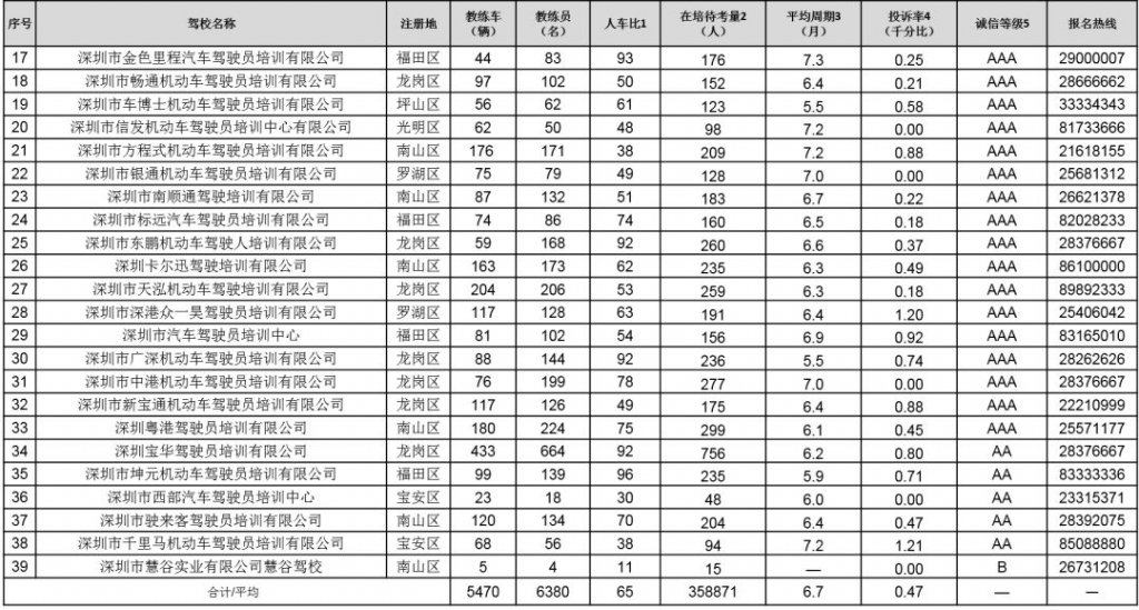 以下對深圳各駕校詳細信息進行公布,市民可根據(jù)下表,選擇人車比和在培待考量相對較低、學車周期較短、投訴率較低、誠信評價等級較高的駕校進行培訓: