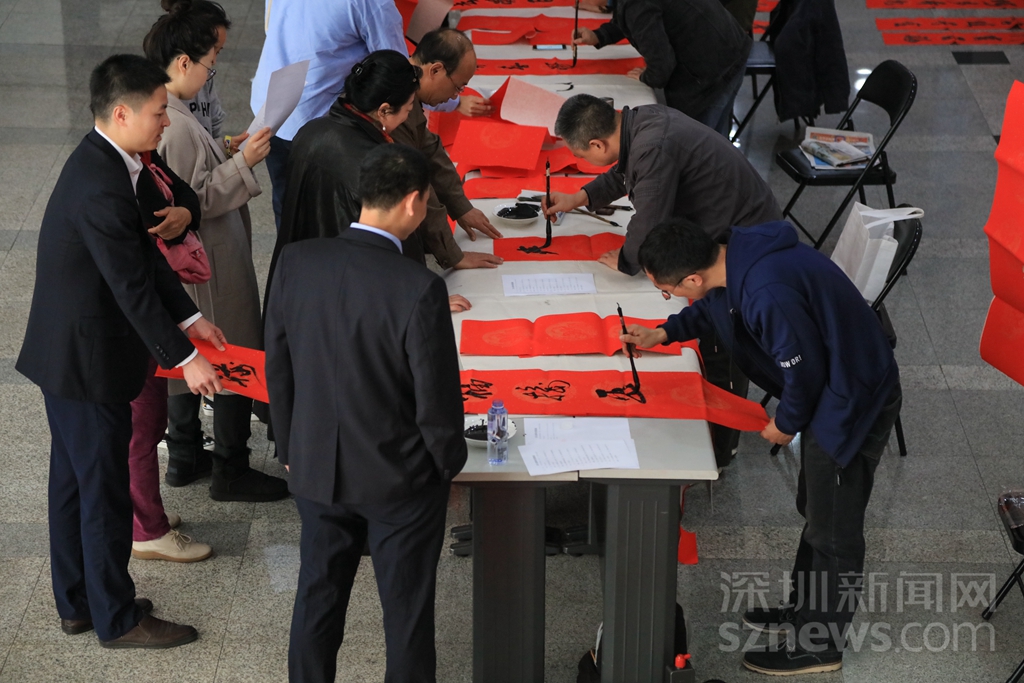 過年貼春聯(lián),是中華民族的傳統(tǒng)習(xí)俗之一??梢哉f,春聯(lián)一出,年味十足。記者在深圳商報大廈一樓活動現(xiàn)場看到,工作人員早已準(zhǔn)備好了春聯(lián)的紅紙和筆墨,多位書法了得的記者編輯揮毫潑墨,創(chuàng)作出了一幅幅寓意喜慶吉祥的對聯(lián),并免費贈送給同事。不少人為了能拿到新鮮出爐的春聯(lián),提前在現(xiàn)場排隊等候。