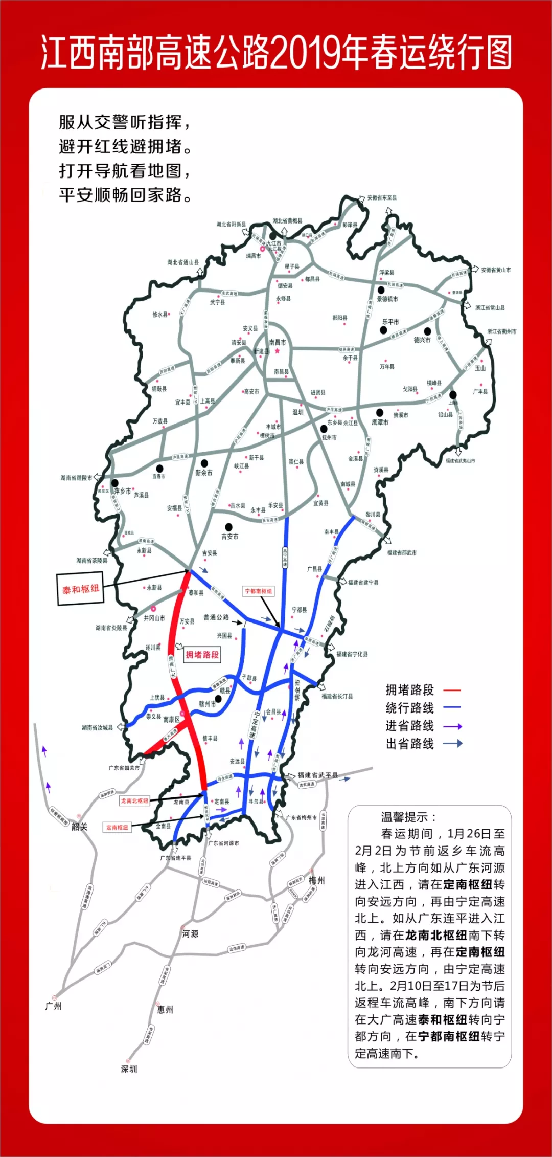 由長(zhǎng)深高速北上,在廣東河源市境內(nèi)轉(zhuǎn)龍河高速進(jìn)入江西,后由定南樞紐轉(zhuǎn)寧定高速聯(lián)絡(luò)線(S86),38公里后再由寧定高速北上,以避開大廣高速擁堵路段。