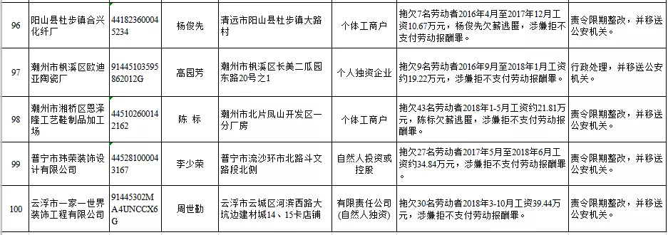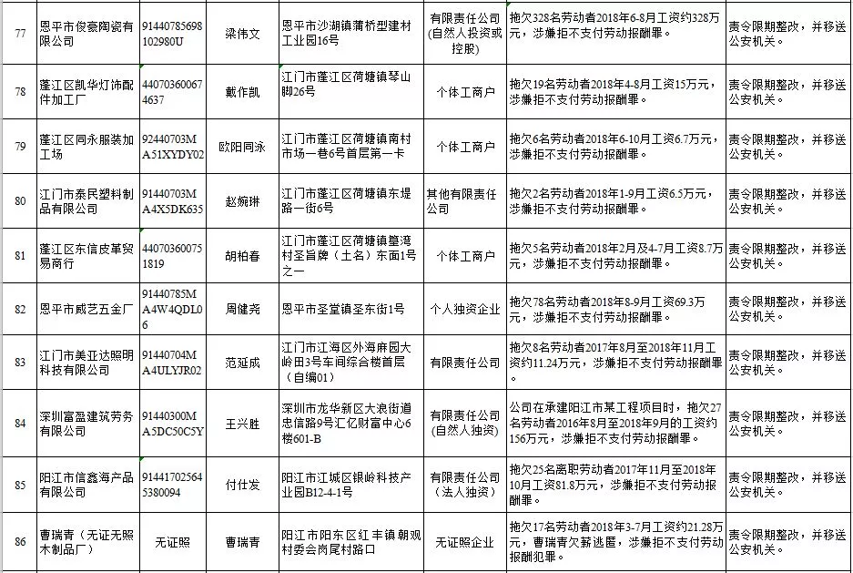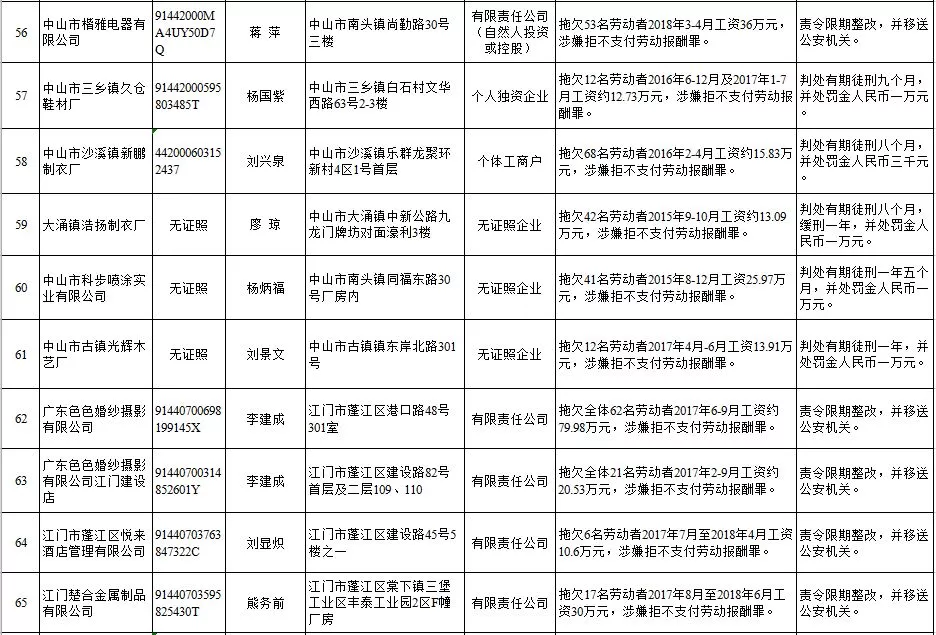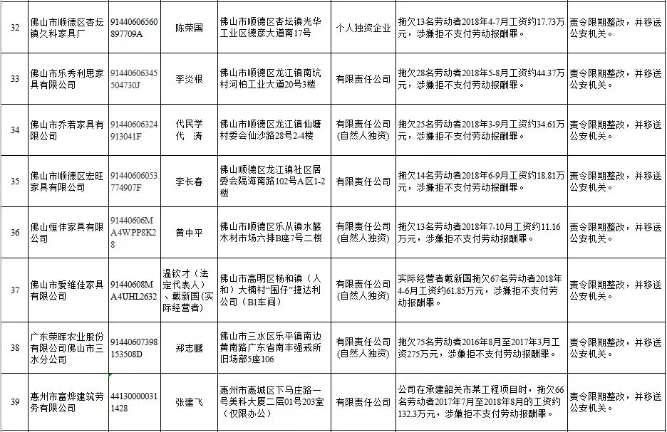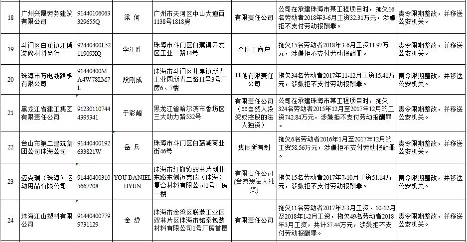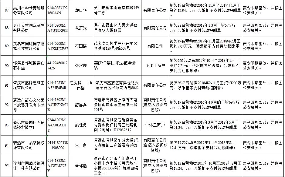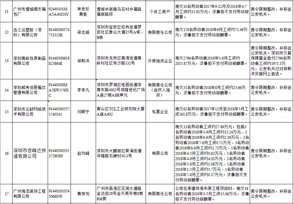 深圳新聞網(wǎng)2019年1月29日訊 (記者 劉婷)據(jù)廣東發(fā)布消息,省人社廳近日公布,2019年第一批用人單位重大勞動保障違法行為名單。到底是哪些企業(yè)在惡意欠薪?這些“老賴”企業(yè)的營業(yè)執(zhí)照、地址、法人等等超全信息都在這!
