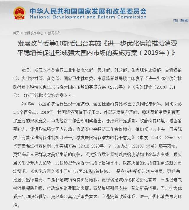 南方+2019年1月30日訊 1月29日,發(fā)改委等部門印發(fā)《進一步優(yōu)化供給推動消費平穩(wěn)增長促進形成強大國內市場的實施方案 (2019年 ) 》(以下簡稱《方案》)。