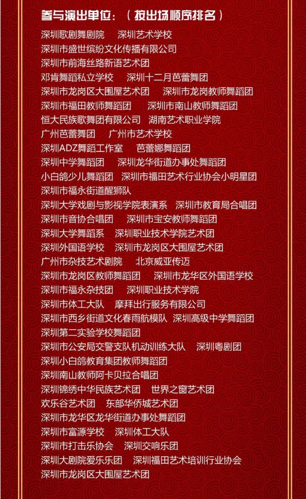 深圳春晚由央視主持人李思思、深圳衛(wèi)視主持人龐瑋、楚喬和香港著名主持人陳啟泰共同主持。晚會節(jié)目內(nèi)容豐富、表現(xiàn)形式多樣,有歌舞、歌曲、交響樂,還有多媒體互動相聲。演員陣容強(qiáng)大,邀請了張靚穎、廖昌永、郎朗、周華健、汪明荃、任賢齊、譚維維等多位明星參演,力爭為全國觀眾送上一道豐盛又精彩的年夜“大餐”。