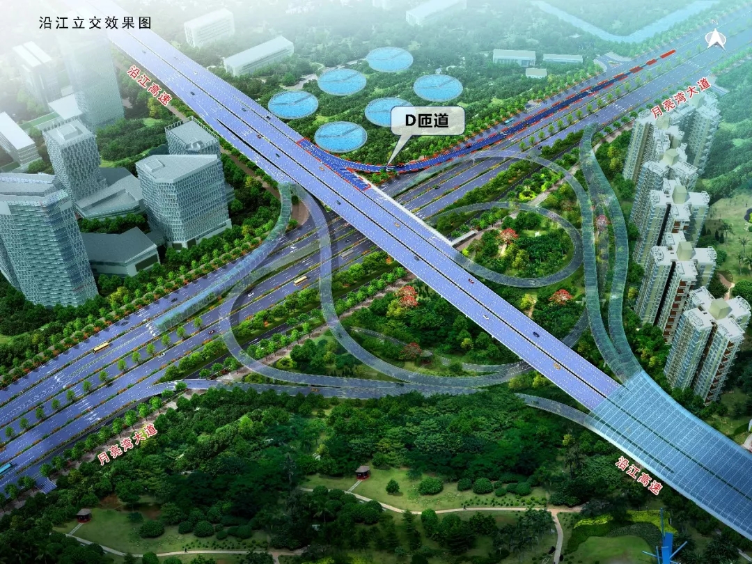 建成后車輛沿月亮灣大道南行可通過D匝道直接進入沿江高速往廣州方向行駛。