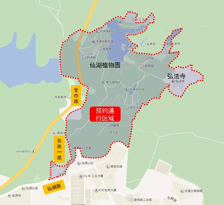 仙湖路(蓮十路東段)及仙湖植物園,含仙湖植物園正門立體停車樓,仙湖植物園內(nèi)弘法寺停車場(chǎng)。