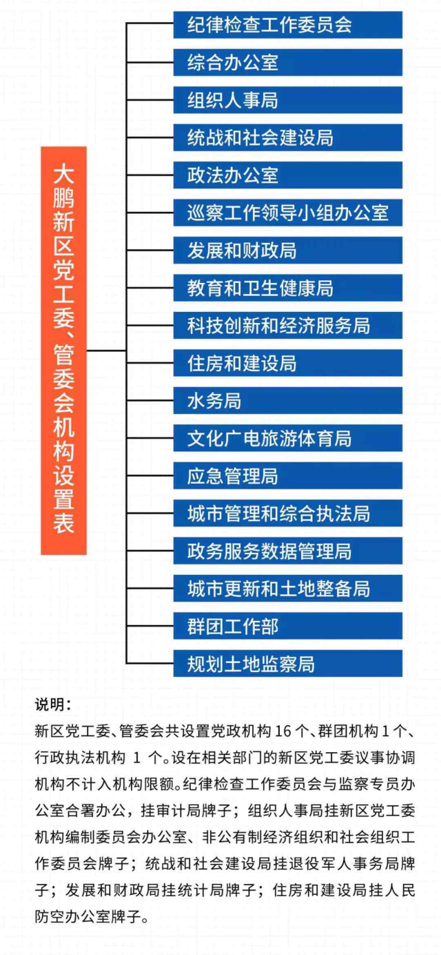 機(jī)構(gòu)改革后,大鵬新區(qū)共設(shè)置黨政機(jī)構(gòu)16個(gè)、群團(tuán)機(jī)構(gòu)1個(gè)、