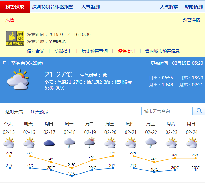 市氣象局預(yù)計(jì),15-16日深圳市可見(jiàn)陽(yáng)光,溫暖濕潤(rùn)早晚有(輕)霧,氣溫在20-28℃;17-18日天氣轉(zhuǎn)涼,沿海及高地陣風(fēng)可達(dá)8級(jí);18日有小到中雨;19日小雨轉(zhuǎn)多云。請(qǐng)市民注意關(guān)注低能見(jiàn)度和大風(fēng)對(duì)交通和戶(hù)外作業(yè)安全的影響。