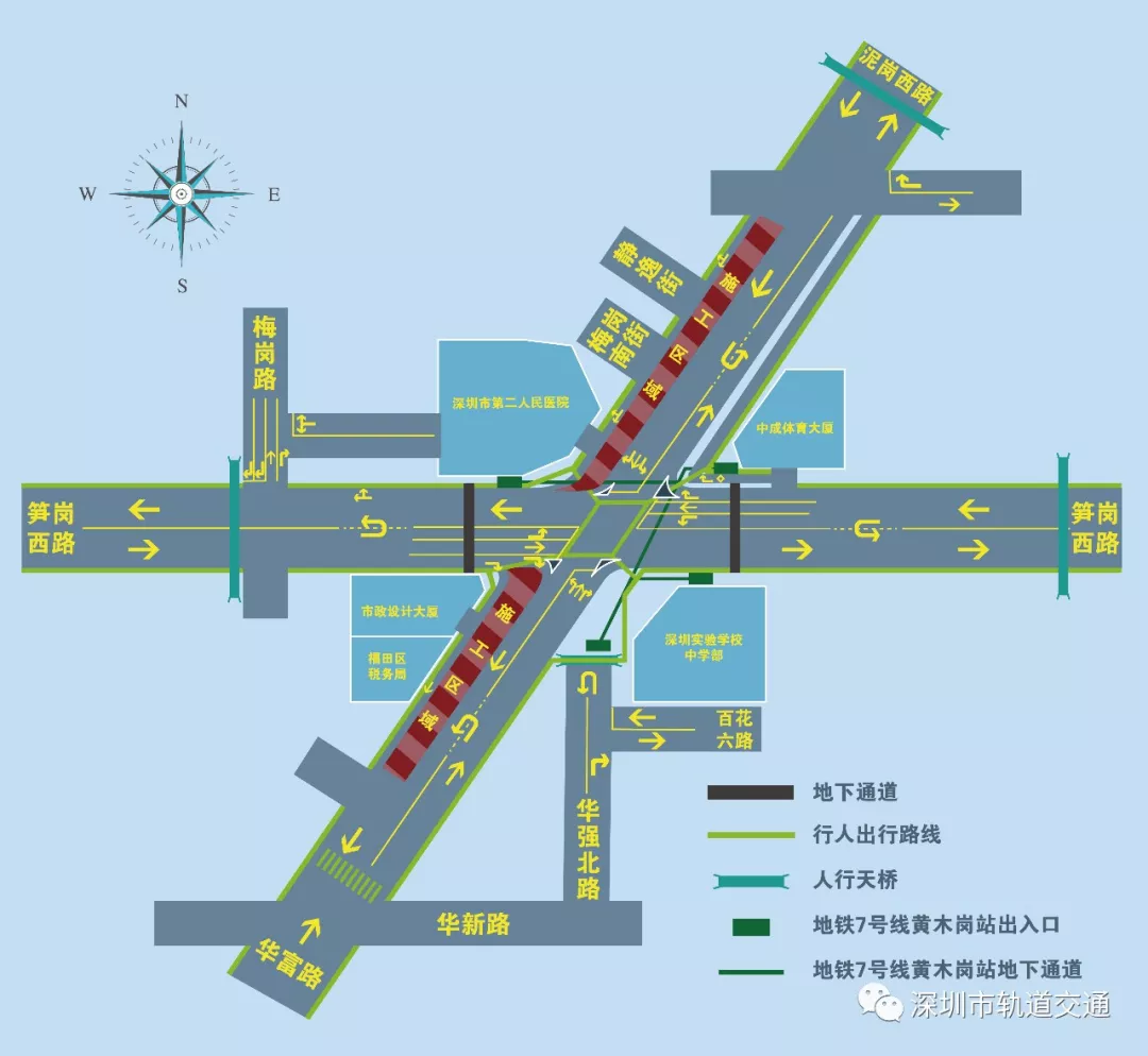 行人可利用平交路口、既有人行天橋、地下通道、地鐵7號線黃木崗站4個出入口過街。