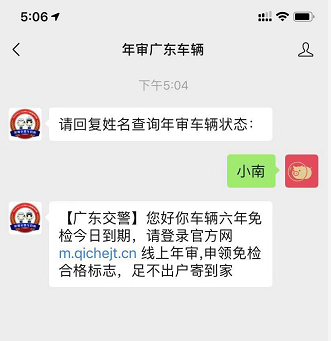 隨便輸入字符后,公眾號(hào)提醒,“車(chē)輛六年免檢今日到期”要求登錄官網(wǎng)線上年審。