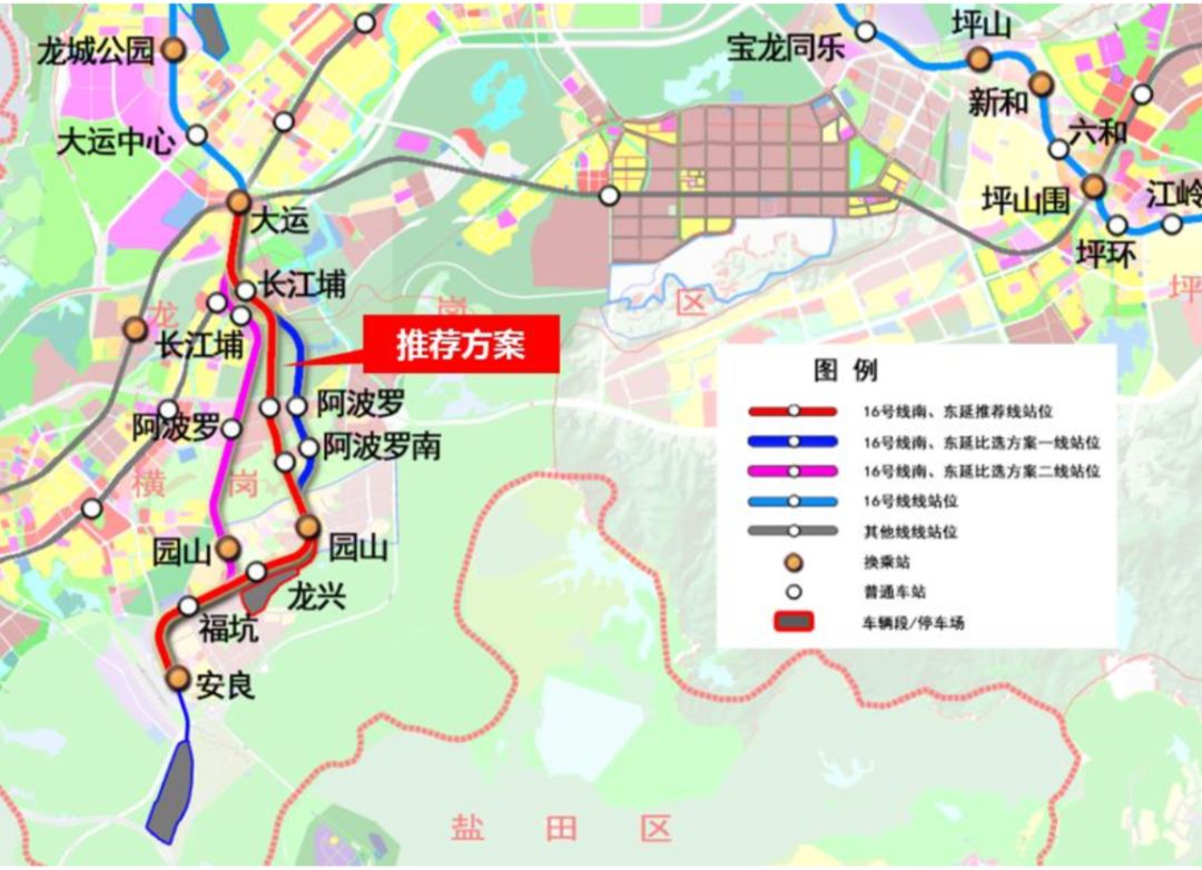 16號線南延對于支持重點產業(yè)區(qū)發(fā)展、強化龍崗中心城與橫崗、鹽田的區(qū)域聯(lián)系、構筑城際樞紐具有重要意義。線路從大運站引出,沿龍崗大道敷設,轉入長江埔路并設長江埔站,然后向南進入阿波羅產業(yè)園并設阿波羅站,繼續(xù)向南進入阿波羅產業(yè)區(qū)并設阿波羅南站,向南進入萬福路并設園山站,然后沿公園路敷設,轉入沙荷路在沙荷路與龍興路交叉口設龍興站,在沙荷路與安業(yè)路交叉口設??诱?,最后沿惠鹽中路進入安良村,設終點站安良站。線路全長約7.8km,采用地下敷設。