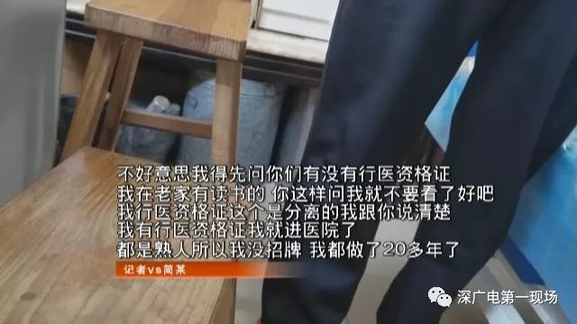 簡某的名片上,印著他是醫(yī)學院畢業(yè),有20多年治療經(jīng)驗,他的治療對骨折脫位通風腰突癥有特效,甚至半身不遂后遺癥都可以治。名片上,簡某有兩個營業(yè)點,分別在龍崗坂田和布吉。但地址只顯示大范圍,沒有房號。原來,找他看病,先得電話預(yù)約,然后他才告訴你具體房號。昨天,記者想辦法預(yù)約到簡某,他說可以在坂田五和路附近的吉豐樓給記者看病。記者來到現(xiàn)場,看到樓下沒有任何標識,不過電梯里有塊不大的牌子,寫著“跌打骨傷”電話號碼和門鈴0305字樣。