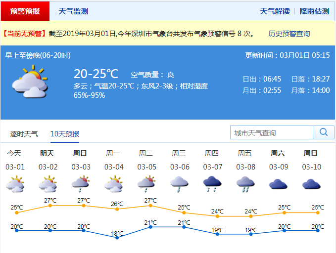 深圳新聞網(wǎng)2019年3月1日訊(記者陳婕)今天的陽(yáng)光似乎溫暖過(guò)了頭,太陽(yáng)的出現(xiàn),緩解了潮濕的情況,未來(lái)兩天深圳繼續(xù)溫暖濕潤(rùn),早晚能見(jiàn)度較低,周末兩天多云,部分時(shí)間可見(jiàn)陽(yáng)光。而從3月3日開(kāi)始,深圳將連續(xù)有雨。