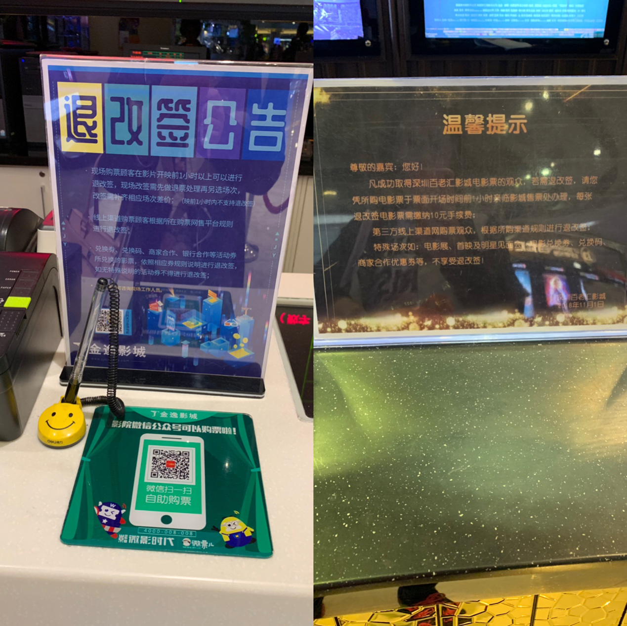 線上支持“退改簽”的影院不多,那么線下電影院“退改簽”的情況怎么樣?記者昨日到福田中心城的多家影院了解情況?!霸谖覀兦芭_購買的電影票,在影片開映前1小時以上可進行退改簽,但如果是在線上的售票渠道購買的電影票,我們不支持退改簽?!苯鹨萦俺侵行某堑赇N售員說。記者走訪發(fā)現(xiàn),福田多家影院的售票處均有“退改簽”的公告,注明不同購票渠道的不同退改簽流程,以及退改簽的時間和費用。