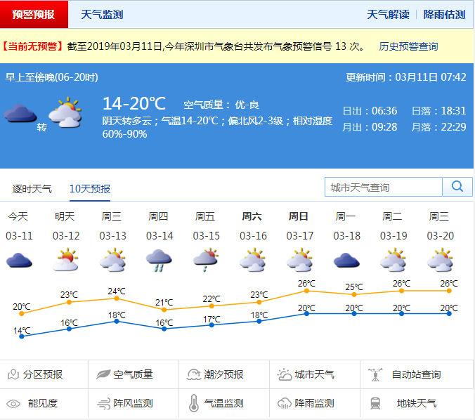 深圳新聞網(wǎng)2019年3月11日訊 自3月5日起,深圳已連續(xù)6日出現(xiàn)降雨,不少市民抱怨,再不出太陽(yáng),衣服都要發(fā)霉了。好在持續(xù)多日的降雨終于結(jié)束,“流浪”許久的太陽(yáng)要回歸了。記者從市氣象局了解到,周一(11日)陰天轉(zhuǎn)多云可見陽(yáng)光,周二周三(12-13日)多云間晴天,氣溫回升。