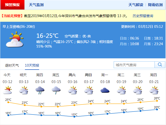 深圳新聞網(wǎng)2019年3月12日訊 今天白天,全市天氣大致晴好,可見陽(yáng)光,早晚最低氣溫徘徊在16℃左右,中午前后最高氣溫升至25℃左右。天氣晴好,適合洗曬。但晝夜溫差大,注意及時(shí)增添衣物。