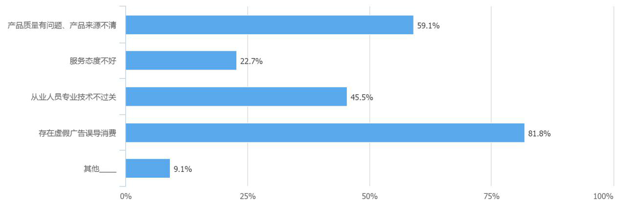 消費(fèi)者們認(rèn)為美容美發(fā)行業(yè)中存在最大的問題是虛假廣告誤導(dǎo)消費(fèi),第二則是產(chǎn)品質(zhì)量問題和產(chǎn)品來源不清。(常軍平/鄭媛/姚苑/田晨夕/曹園芳/田志強(qiáng)/潘寶儀)