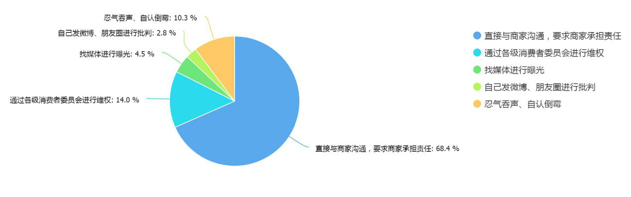 有68.4%的受訪者在遇到消費(fèi)侵權(quán)后選擇直接與商家溝通,要求商家承擔(dān)責(zé)任,10.4%的受訪者會(huì)選擇忍氣吞聲、自認(rèn)倒霉;其中男性消費(fèi)者更傾向于找媒體曝光,而女性消費(fèi)者則傾向于忍氣吞聲。