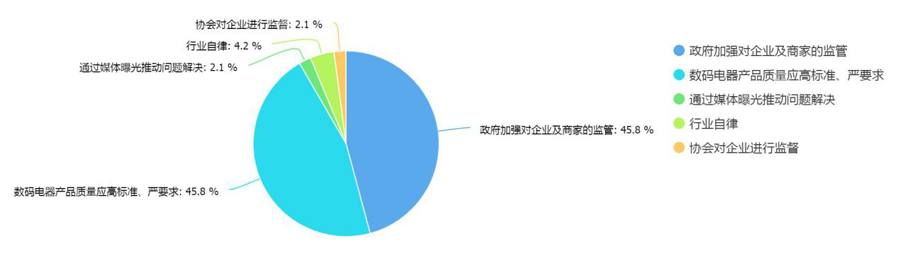 針對(duì)目前數(shù)碼家電行業(yè)中存在的相關(guān)問題,有45.8%的消費(fèi)者建議通過政府加強(qiáng)對(duì)企業(yè)及商家的監(jiān)管,另有部分網(wǎng)民建議數(shù)碼家電類產(chǎn)品應(yīng)該設(shè)立更高的的標(biāo)準(zhǔn),對(duì)企業(yè)應(yīng)該提出更高的要求。
