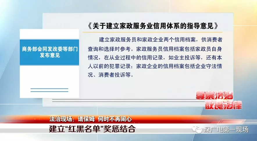 趙坤:在深圳,請保姆,育嬰師,鐘點(diǎn)工等等是很多家庭的剛需,但是很多人也抱怨說,要請個好的保姆阿姨實(shí)在是太難了,有些雇主因?yàn)楦鞣N原因家里來來去去換了好幾個阿姨,有些甚至還跟家政公司調(diào)解不成鬧上了法庭。防患于未然,商務(wù)部等部委這次發(fā)布的意見,建立信用檔案,可謂來的正當(dāng)時。我們也期待深圳能盡快出臺家政行業(yè)信用平臺,期待深圳的家政行業(yè)能更加透明,更加規(guī)范。