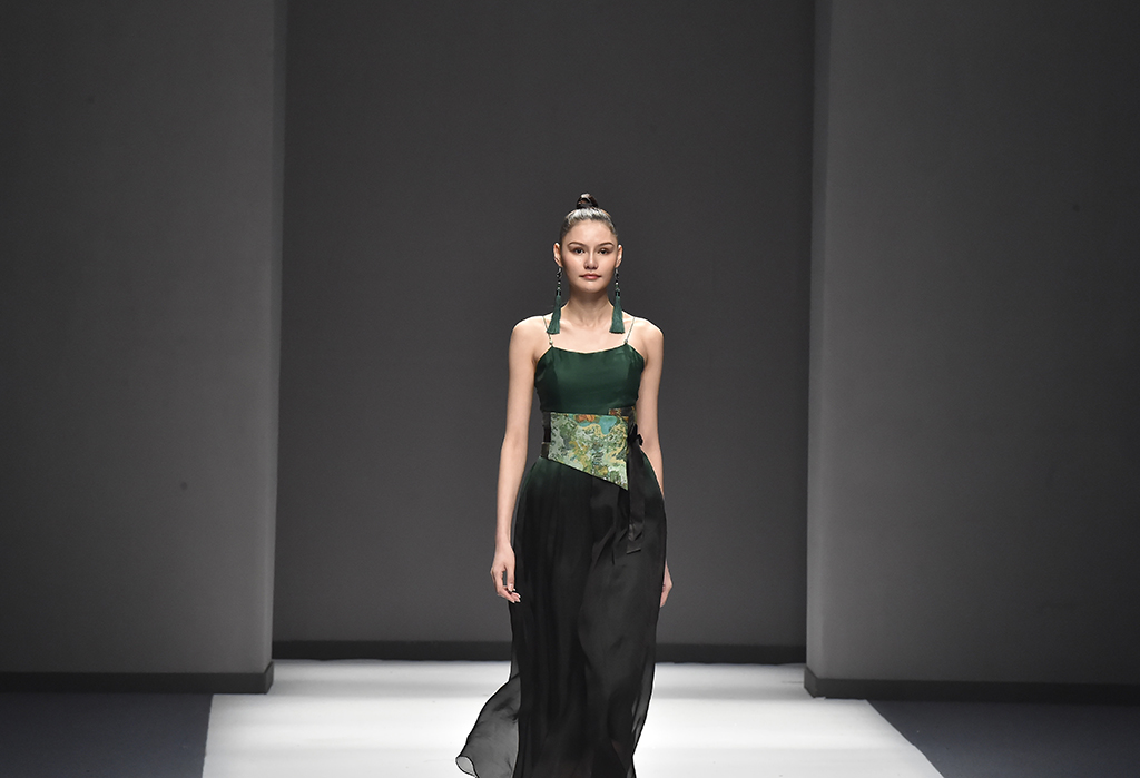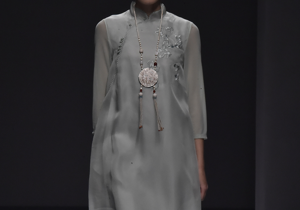 模特正在展示品牌Sunshine見(jiàn)花開(kāi)的服裝服裝帶有東方美感