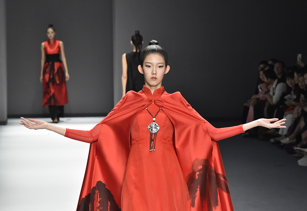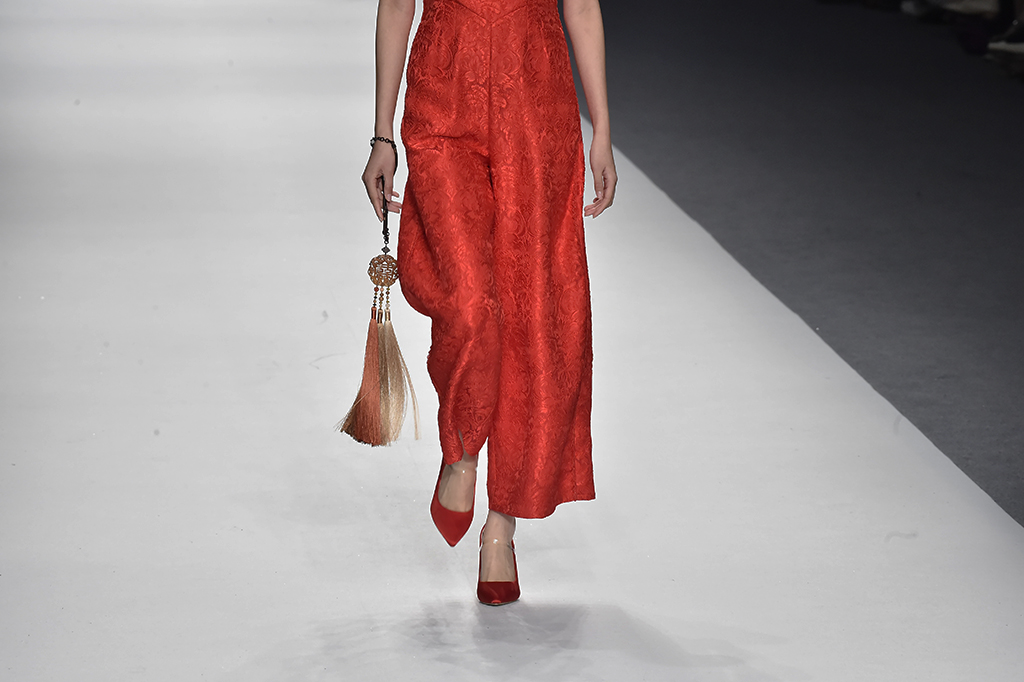 模特正在展示品牌Sunshine見(jiàn)花開(kāi)的服裝 紅色的服裝盡顯東方美感