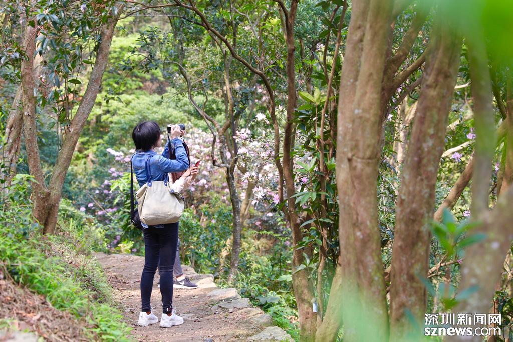 梧桐山成踏春賞花打卡點,市民用相機記錄下毛棉杜鵑之美。