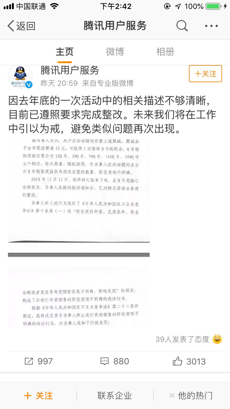 3月20日,微博認(rèn)證為騰訊公司公關(guān)總監(jiān)張軍在微博中解釋:因去年年底的一次活動(dòng)中的相關(guān)描述不夠清晰,目前已遵照要求完成整改。未來(lái)我們將在工作中引以為戒,避免類似問(wèn)題再次出現(xiàn)。