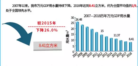 2、萬(wàn)元GDP水耗由2010年的19.95立方米降至2018年的8.41立方米,萬(wàn)元工業(yè)增加值用水量從14.15立方米降至5.22立方米,全市供水管網(wǎng)漏損率由2013年的12.72%降至2018年的10.66%。