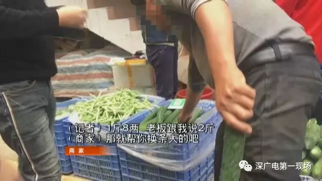 隨后,記者再次來(lái)到另外一家蔬菜攤檔,同樣選購(gòu)了兩根黃瓜,商家稱(chēng)重同樣顯示的是兩斤,不過(guò)當(dāng)記者把自己的便攜秤掏出來(lái)之后,商家這回給自己變了個(gè)戲法,說(shuō)要給記者換條大的。