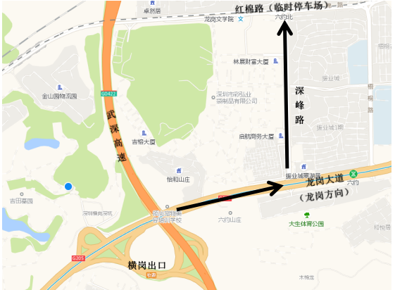 2、自市區(qū)出發(fā)路線:往龍崗大道龍崗方向行駛,在深峰路路口左轉(zhuǎn)進入,經(jīng)深峰路進入紅棉路臨時停車場,轉(zhuǎn)乘接駁大巴。