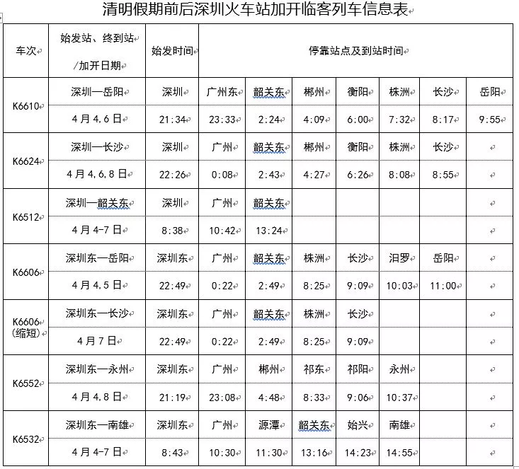 深圳站將加開3對(duì)臨客列車,始發(fā)車次為開往岳陽(yáng)的K6610次、開往長(zhǎng)沙的K6624次和開往韶關(guān)東的K6512次;