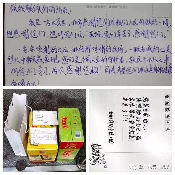 據(jù)消防員們介紹,收到的禮物中有牛奶、王老吉等飲料,有些是市民親自送上門(mén)的,有些則是由外賣(mài)員送來(lái)的,跟禮物一起的還有一些信件和紙條,也許從這里面,我們可知一二。
