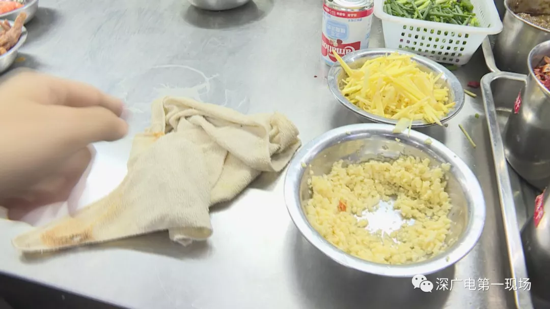 執(zhí)法人員質(zhì)問抹布的用途時,廚工居然把抹布拿過去用開水燙一燙就算消毒了。