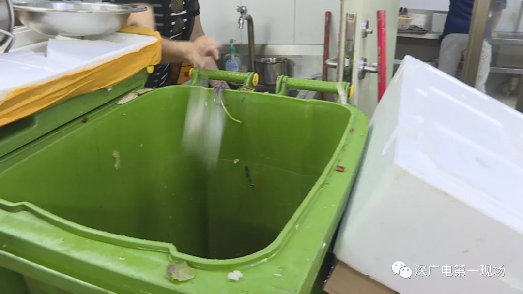 在接下來的檢查中,執(zhí)法人員發(fā)現(xiàn),后廚操作間的過道放置了幾個大垃圾桶,裝滿了餐廚垃圾卻沒有加蓋。