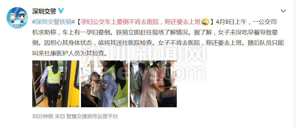 深圳新聞網(wǎng)2019年4月9日訊(記者 施冰冰)記者從“深圳交警”處了解到,4月9日上午,有公交司機(jī)求助稱,車上有一孕婦暈倒。鐵騎立即趕往現(xiàn)場了解情況。據(jù)了解,女子未沒吃早餐導(dǎo)致暈倒。因擔(dān)心其身體狀態(tài),欲將其送往醫(yī)院檢查。女子不肯去醫(yī)院,稱還要去上班。隨后隊(duì)員只能叫來社康醫(yī)護(hù)人員為其檢查。