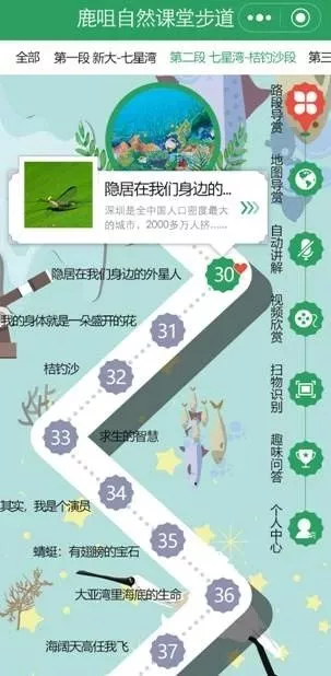 隨著綠道行進的深入,記者來到第一個自然觀察研習點,這里配置有自然研習導賞標識牌,牌上有植物動物的照片及介紹,牌子的角落有供游客學習的二維碼。記者了解到,新區(qū)同時開發(fā)建立一套APP自然課堂學習系統(tǒng),在綠道全程配套建設64個實地自然觀察研習點,設置了260余個自然研習導賞標識,接入專業(yè)智能識別軟件,配以體量龐大生物影像數(shù)據(jù)庫。掃碼進入APP就可以通過文字、圖片和音像資料了解到“大鹿線”全景介紹和分區(qū)介紹,以及物種相關(guān)知識。同時,該系統(tǒng)利用手機GPS定位技術(shù),為行進中的市民游客自動講解所到之處的自然課堂語音課程。來自羅湖的資深驢友李先生告訴記者,來“大鹿線”徒步,不僅鍛煉身體愉悅心情,還可以學到豐富的自然知識,打開APP行走全程,猶如參觀了一座多維一體的山?!叭安┪镳^”。