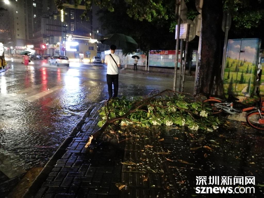暴風(fēng)雨模式下,樹枝折斷散落在路面上。(記者 邱曉潔 攝)