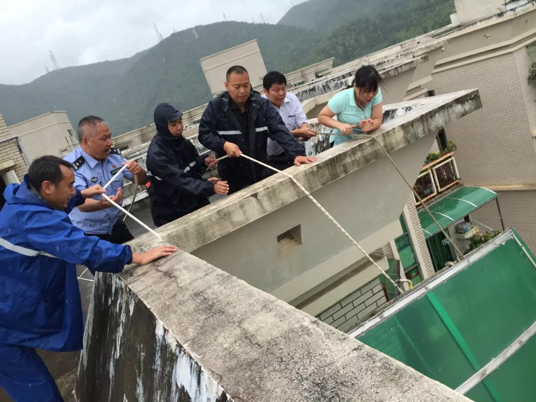 ▲2017年8月23日中午,在福田區(qū)梅林一村88棟,一家住戶(hù)的靠墻陽(yáng)臺(tái)頂蓬固定支撐點(diǎn)已全部脫落,導(dǎo)致整個(gè)頂蓬向外傾斜,十分危險(xiǎn),福田公安分局梅林派出所民警聯(lián)合社區(qū)居民一起現(xiàn)場(chǎng)處置。