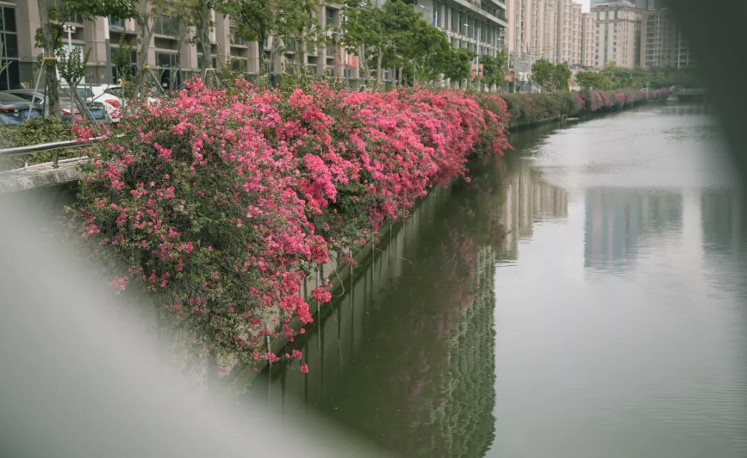 經(jīng)過寶安人不懈的努力,西鄉(xiāng)河已不見了黑臭的身影,此時盛開的紅色、紫色勒杜鵑清晰地倒映在河面上。
