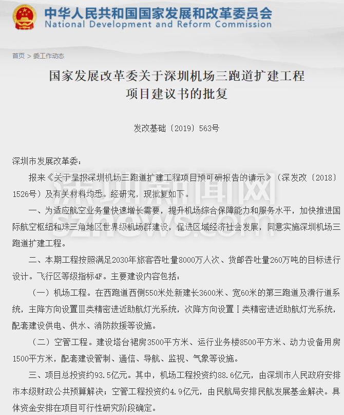 國家發(fā)展改革委關(guān)于深圳機場三跑道擴建工程項目建議書的批復截圖