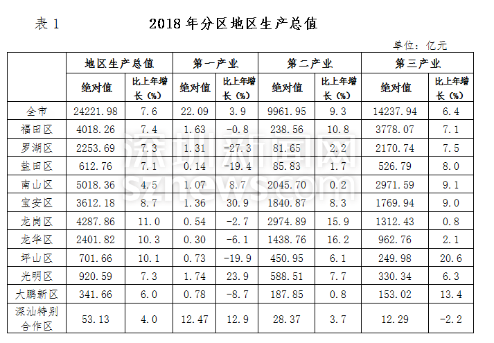 深圳新聞網(wǎng)2019年4月19日訊(記者 劉夢婷 通訊員 胡雪濤)4月19日,記者從深圳市統(tǒng)計局獲悉,深圳市2018國民經(jīng)濟與社會發(fā)展統(tǒng)計公報出爐:全市實現(xiàn)地區(qū)生產(chǎn)總值24221.98億元,比上年增長7.6%,常住人口達1302.66萬人。人均可支配收入57543.60元,居民人均消費支出40535.02元。總體來看,2018年深圳經(jīng)濟運行穩(wěn)健,主要經(jīng)濟指標表現(xiàn)良好,高質(zhì)量發(fā)展扎實推進。