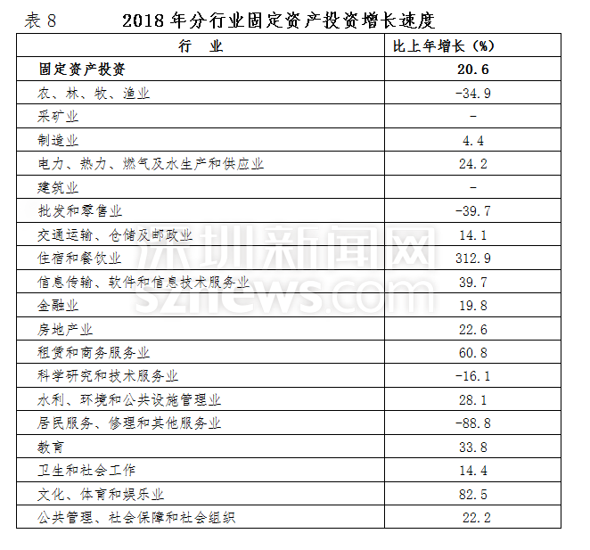 2018年,深圳全市固定資產(chǎn)投資比上年增長20.6%。其中,房地產(chǎn)開發(fā)投資增長23.6%;非房地產(chǎn)開發(fā)投資增長18.4%。分投資主體看,國有經(jīng)濟(jì)投資增長36.7%;民間投資增長12.5%;港澳臺商經(jīng)濟(jì)投資下降22.6%;外商經(jīng)濟(jì)投資增長30.3%。